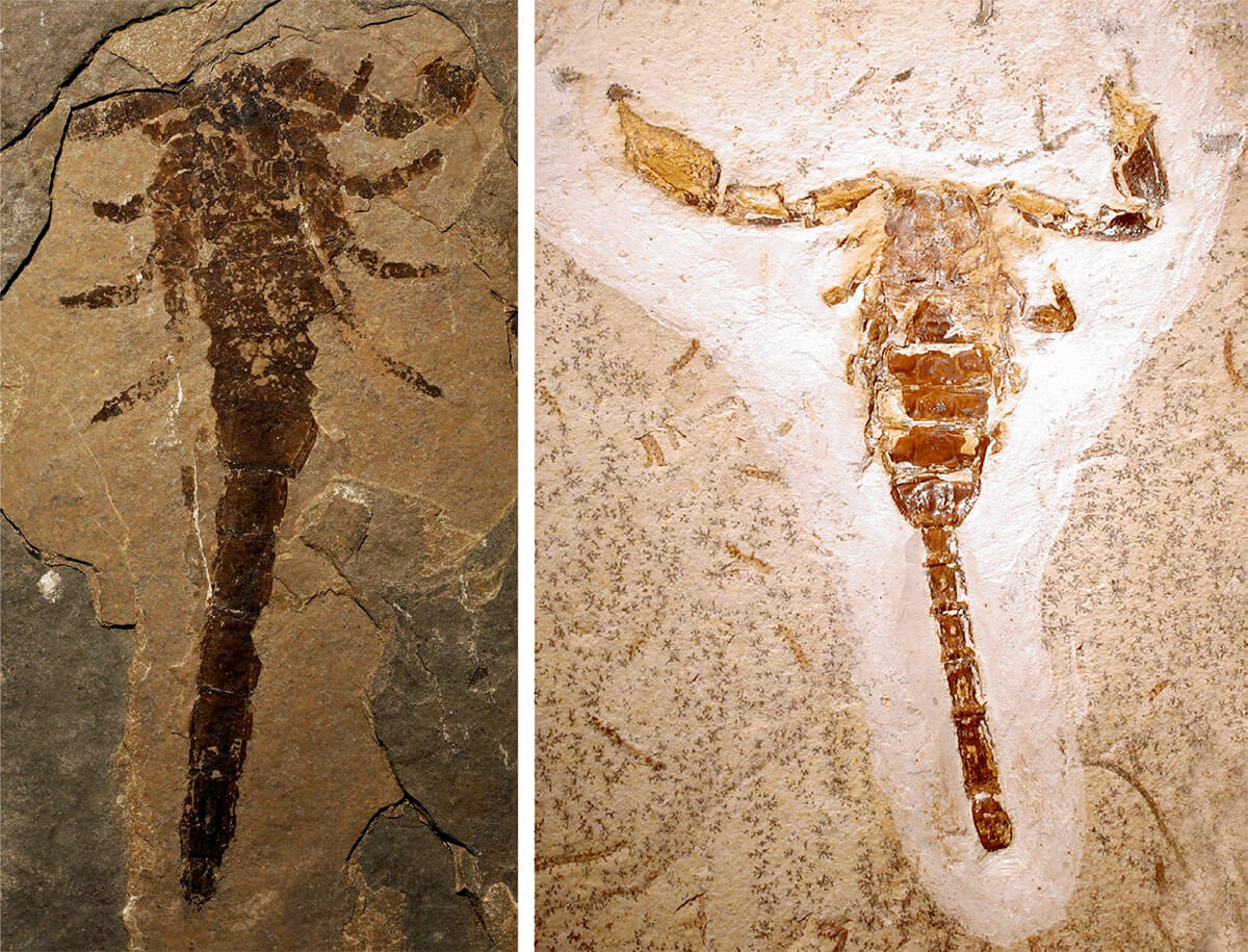 Gli scorpioni sono considerati tra i primi animali complessi ad essere usciti dall’ambiente marino per colonizzare la terraferma. Ad esempio, Dolichophonus loudonensis risale al periodo Siluriano, oltre 430 milioni di anni fa, ed è il fossile di aracnide più antico ad oggi conosciuto (Figura 1). Da allora, questi sofisticati “fossili viventi” hanno saputo espandersi sull’intero pianeta, colonizzando quasi tutti gli habitat della fascia tropicale e temperata. Quest’espansione dimostra le notevoli capacità adattative che permettono loro di vivere in ambienti estremi, ad altitudini superiori ai 5500 metri o in grotte profonde 800 metri. Sono tra i principali abitanti degli ambienti desertici, dove le temperature che oscillano tra i 47 °C e i -12 °C, l’aridità e l’irraggiamento solare rendono la sopravvivenza molto difficile.