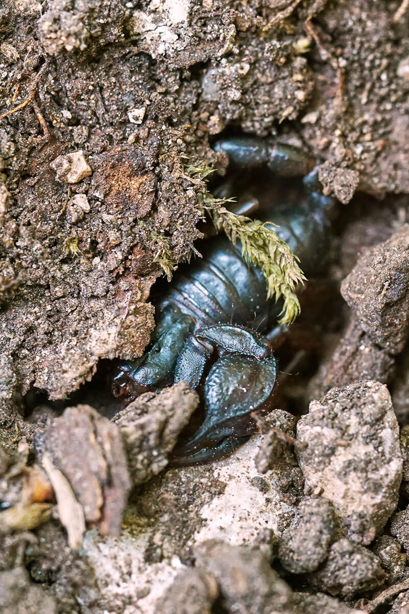 Gli scorpioni sono diffusi un po’ in tutti gli ambienti che permettano loro di trovare sufficienti nascondigli. Una caratteristica comune a tutte le specie, infatti, è quella di passare la maggior parte del tempo immobili, nascosti in un anfratto (Figura 20). Solitamente sfruttano gli spazi sotto le pietre, nelle crepe tra le rocce, sotto le cortecce degli alberi, ma anche manufatti umani come muretti a secco, ruderi, costruzioni in legno o muratura che presentino fessure. Molte specie scavano nel terreno lunghe tane, fino anche a due metri di profondità, utilizzando le zampe, i pedipalpi o il metasoma (la “coda”). Queste, si possono trovare nel terreno umido delle foreste, in terreni sabbiosi dei deserti e anche in quelli argillosi duri e compatti, che vengono sgretolati con i cheliceri.