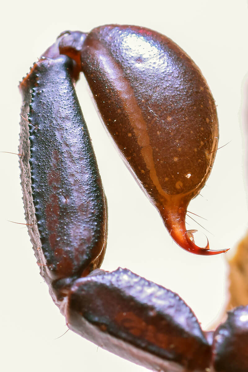 È presente un segmento post-anale, chiamato telson, che consiste in una parte bulbosa (contenente le ghiandole velenifere) e in un pungiglione arcuato (Figura 6). Il cefalotorace presenta 6 paia di appendici. Il primo paio sono i cheliceri, composti da 3 segmenti disposti a formare una piccola chela mobile, che viene utilizzata principalmente per nutrirsi. Il secondo paio di appendici sono i vistosi pedipalpi, composti da sei segmenti, denominati dal più prossimale coxa, trocantere, femore, patella, tibia e tarso. Questi ultimi formano le caratteristiche chele, che hanno principalmente funzione raptatoria (cattura della preda) e difensiva. Portano inoltre numerosi organi sensoriali e vengono spesso usati anche come organi di scavo e di difesa.