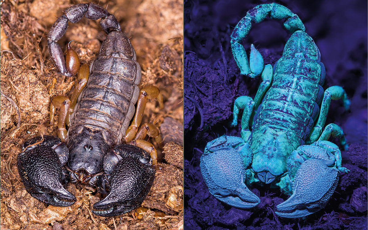 La fluorescenza degli scorpioni è comune a tutte le famiglie e permane anche nelle esuvie (le cuticole che vengono abbandonate durante il processo di ecdisi). Sebbene la fluorescenza desti la curiosità di molti appassionati e studiosi, non è tuttora chiara la sua funzione evolutiva. Alcuni studi sembrano indicare che sia legata alla percezione da parte dell’animale di determinate lunghezze d’onda, utilizzate dall’animale per regolare la sua attività circadiana. Non è escluso anche che, per quanto sia un fenomeno sorprendente, la fluorescenza non abbia alcuna funzione biologica e sia solo un “effetto collaterale” dell’evoluzione.
