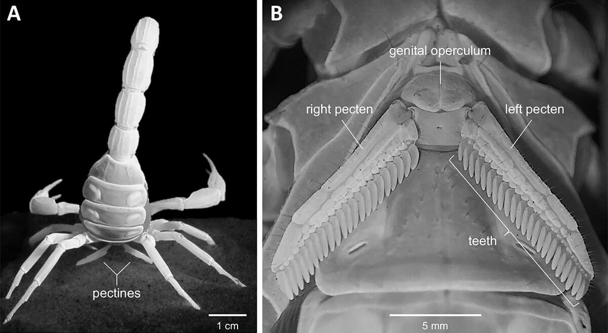 Seguono i pettini (Figura 7), appendici modificate in organi di senso meccanici e chimici caratteristici degli scorpioni, composti da numerosi piccoli lobi disposti in fila, da cui il nome.