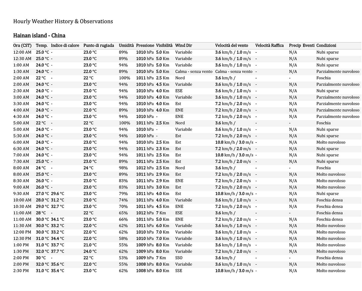 Di sicuro però in natura temperatura e umidità non sono valori fissi, ma sono legati alle variazioni giornaliere e a quelle stagionali. Basterà osservare l‘esempio riportato per una giornata qualunque sull’isola di Hainan – Cina