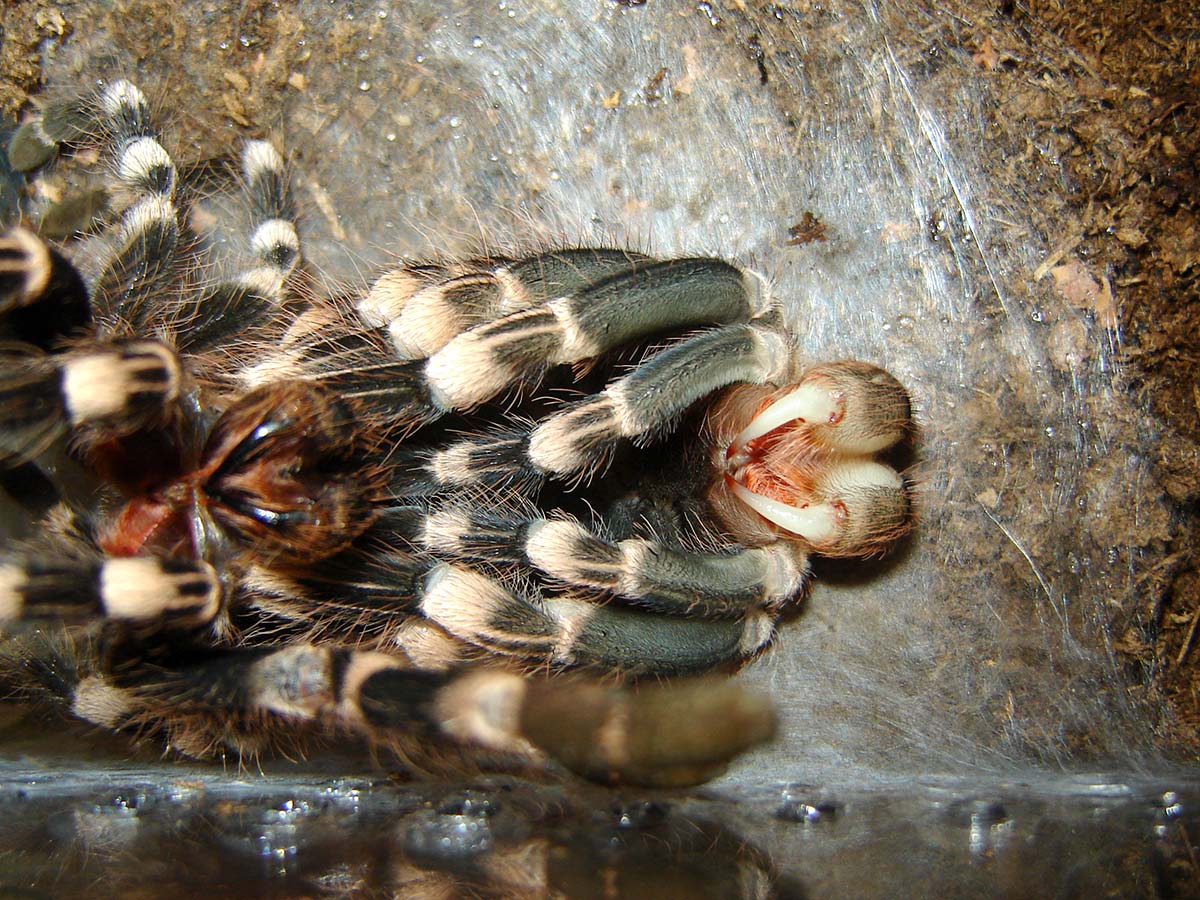 La “muta” si manifesterà invece improvvisamente: il ragno creerà un piccolo tappeto di tela e vi si ribalterà sopra, a ventre in su. Questa posizione particolare non deve spaventare dato che i ragni quando stanno male o muoiono non si ribaltano. Piuttosto è una fase in cui l’allevatore non deve fare nulla, lasciando tranquilla la migale ed evitando di spostare e toccare la teca. La muta può durare alcune ore quindi sarà importante avere pazienza e non intervenire andando a toccare il ragno.