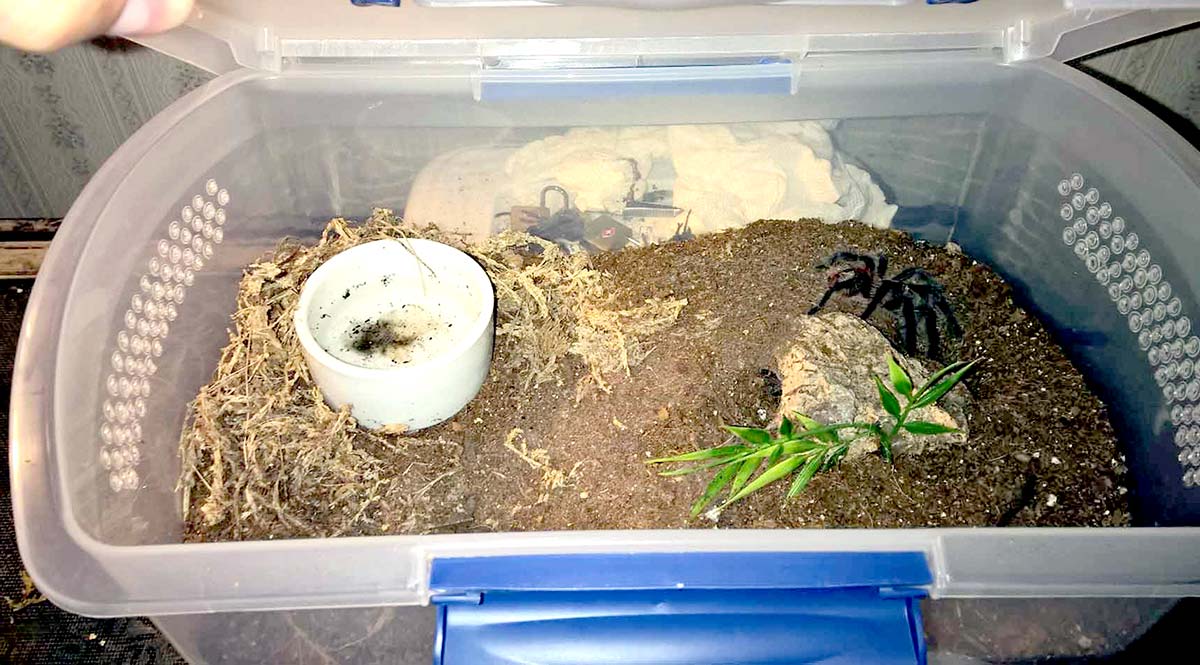 Generalmente varrà la regola per cui un terrario dovrà ospitare soltanto un ragno, essendo questi solitamente poco tolleranti alla presenza di conspecifici. In aggiunta occorrerà fornire lo spazio necessario all’esemplare per compiere i suoi spostamenti, tessere la tela e cacciare, ma senza esagerare: un terrario troppo grande, sovradimensionato, renderebbe molto difficile per il ragno poter cacciare in autonomia le prede somministrate e obbligherebbe l’allevatore a impiegare molto tempo nel controllo periodico delle condizioni igieniche della teca. A tal fine si possono utilizzare sia contenitori specifici in plastica trasparente, acquistabili presso negozi di animali (i fauna-box ad esempio), oppure adattare dei contenitori generici trasparenti per alimenti, indumenti o scarpe (vedi sotto). Se invece disponiamo di spazio e budget più elevato, potremmo utilizzare dei classici terrari in vetro, che offrono migliore visibilità e che disperdono meno calore rispetto ai contenitori in plastica. Questi ultimi sono sicuramente la soluzione preferibile.