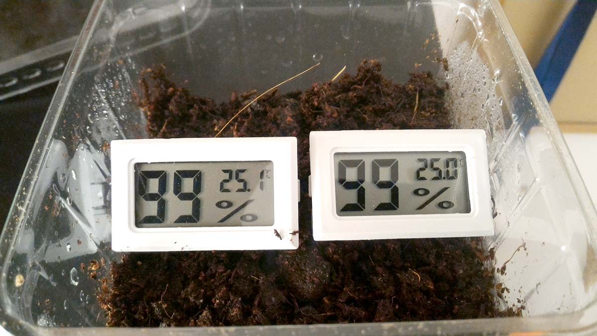 La vera difficoltà nel gestire l’umidità comunque sta nel trovare il giusto equilibrio tra areazione e corretto tasso da mantenere. Potrà ad esempio capitare di dover chiudere con del nastro adesivo le prese d’aria di un terrario prefabbricato, in quanto eccessive, o fare buchi su tutta la parete di un contenitore di plastica adattato. Un occhio esperto riesce a valutare il tasso di umidità anche senza usare degli strumenti particolari. Nonostante ciò, per chi ancora non ha maturato esperienza nell’allevamento di ragni tropicali, è consigliabile non rinunciare ad acquistare un igrometro (meglio se digitale, essendo normalmente più preciso).