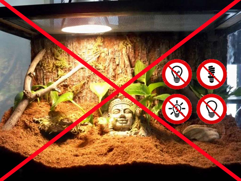 Le lampade infine seccano velocemente l’aria all’interno della teca, condizione questa che è l’esatto contrario di ciò che andrebbe garantito a questi animali tropicali.