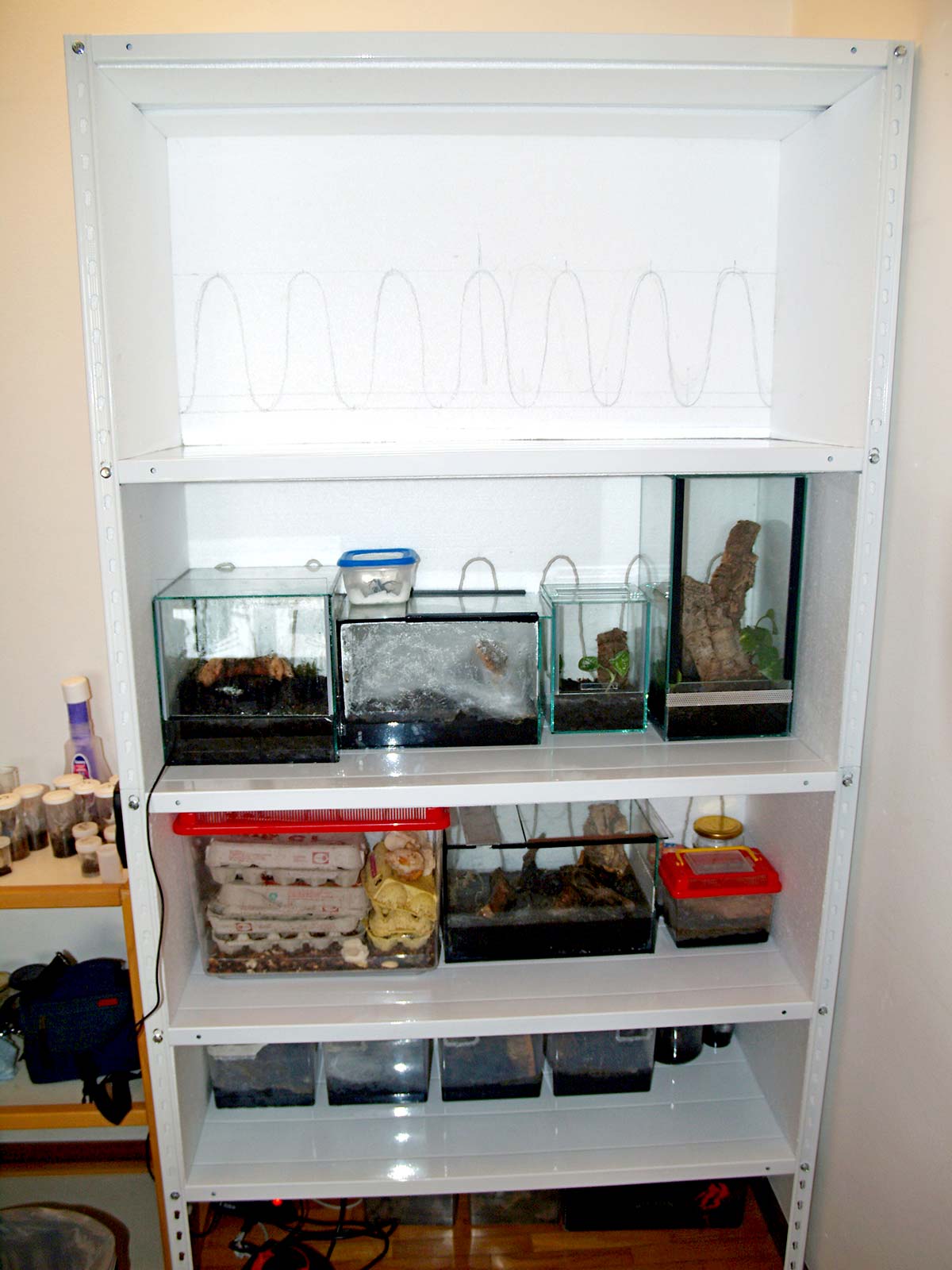Come fonte di riscaldamento si consigliano decisamente i tappetini riscaldanti o i cavetti. Questi semplici riscaldatori a bassa potenza (10-25W) emettono calore per conduzione e quindi vanno posizionati sempre a contatto con la teca, o comunque a piccola distanza. Il cavetto o il tappetino andrà posizionato sulla parete posteriore della teca, all’esterno, e mai sotto! La fonte di calore posta sotto creerebbe una situazione innaturale e inaccettabile per qualsiasi ragno che, naturalmente, è portato a scavare il terreno per ricercare fresco e umido. Con una piastra sotto l’esemplare troverebbe più calore che in superficie. Inoltre il riscaldamento inferiore porta sempre ad una eccessiva evaporazione dell’acqua contenuta nella torba, disseccandola e producendo il fastidioso inconveniente della condensa sulle pareti.