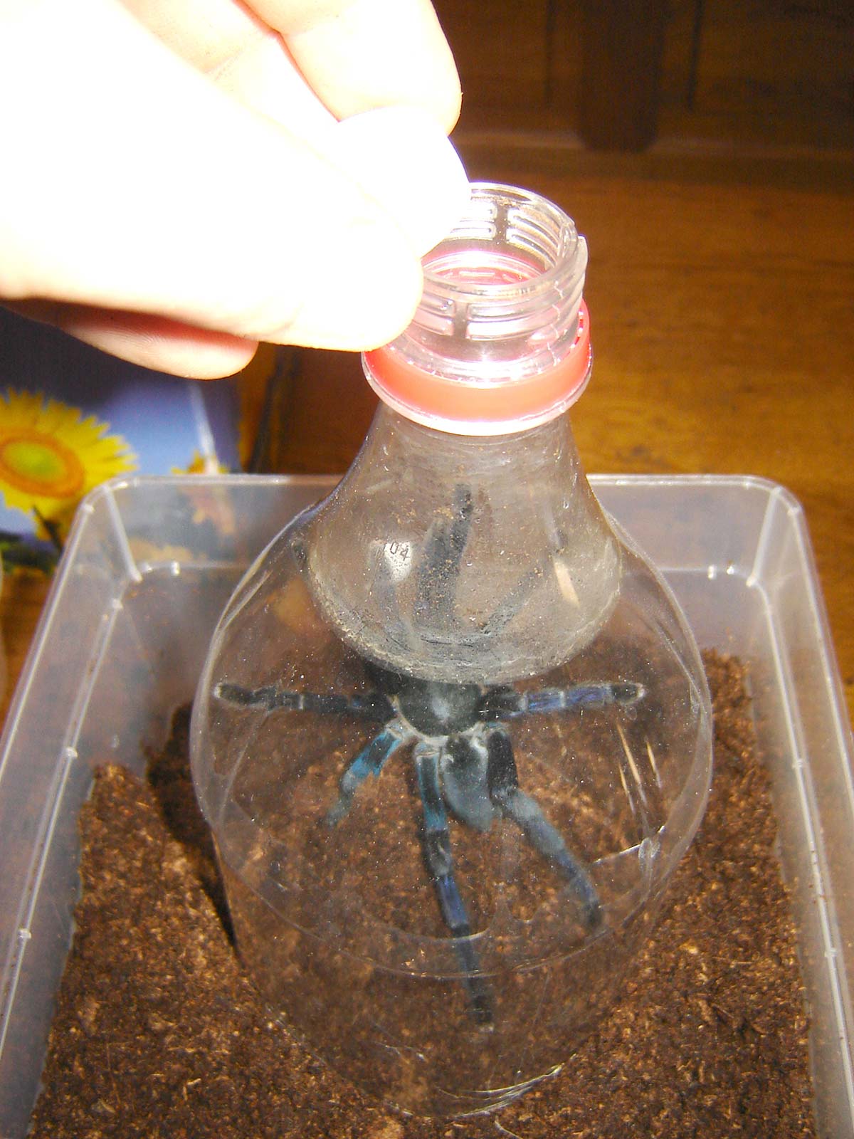 La tecnica più comune e sicura nel compiere questa operazione consiste nell’intrappolare l’animale in un barattolo o contenitore trasparente, imprigionandolo così dall’alto. A tal riguardo, può essere utile accompagnare la migale con un bastoncino o pennello, preferendo quindi strumenti di legno in modo che l’animale non possa farsi male se dovesse morderli.