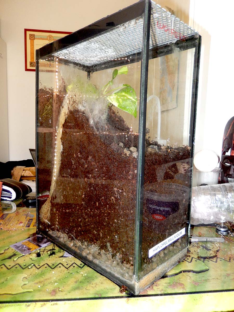 Internamente il terrario potrà essere allestito in maniera spartana. Potrebbe risultare strano che il consiglio sia di utilizzare semplicemente un substrato di torba acida ed un rifugio di sughero, ma ogni elemento aggiuntivo appagherà soltanto i desideri estetici dell’allevatore non fornendo niente di utile alla migale ospitata. In alternativa, si potrà cercare di avvicinarsi il più possibile al loro habitat di provenienza, evitando però tutti quegli elementi naturali che potrebbero diventare pericolosi in terrario (rami appuntiti, rocce taglienti, pozze d’acqua profonde, piante vive che marcendo possono sporcare il substrato ecc …).