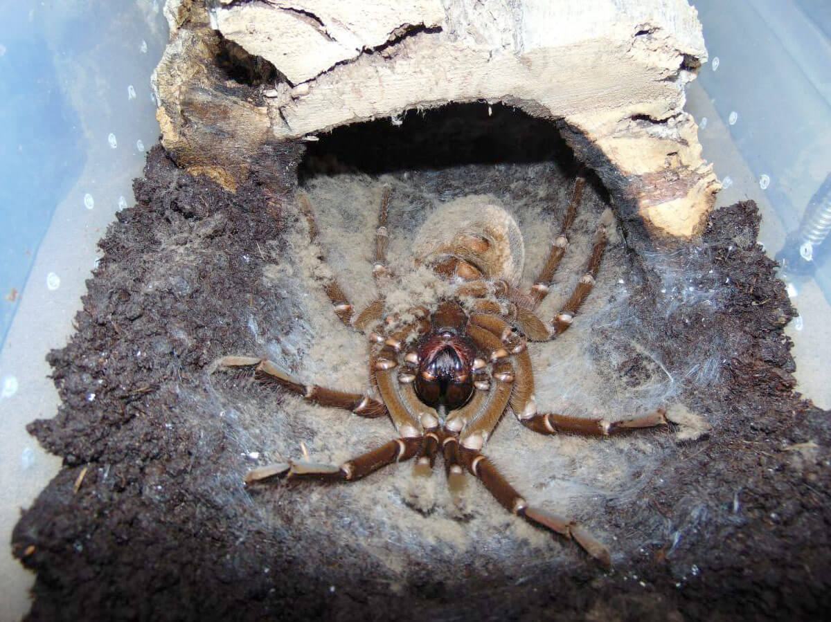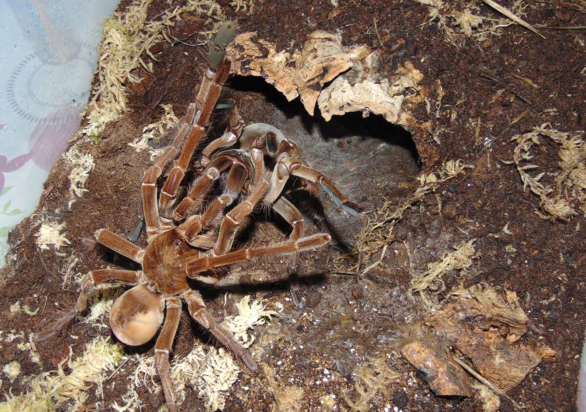 Sicuramente non deve mancare un abbondante substrato, utile a mantenere a lungo costante l’umidità nella teca. Si realizza poi una grossa tana sul substrato idonea a creare un riparo: questo può essere ottenuto sia con un sughero a forma di mezzaluna, sia scavando un rifugio sotto ad un grosso pezzo di sughero infisso nella torba. Qui sotto, in ombra, la migale stazionerà per la maggior parte del tempo.