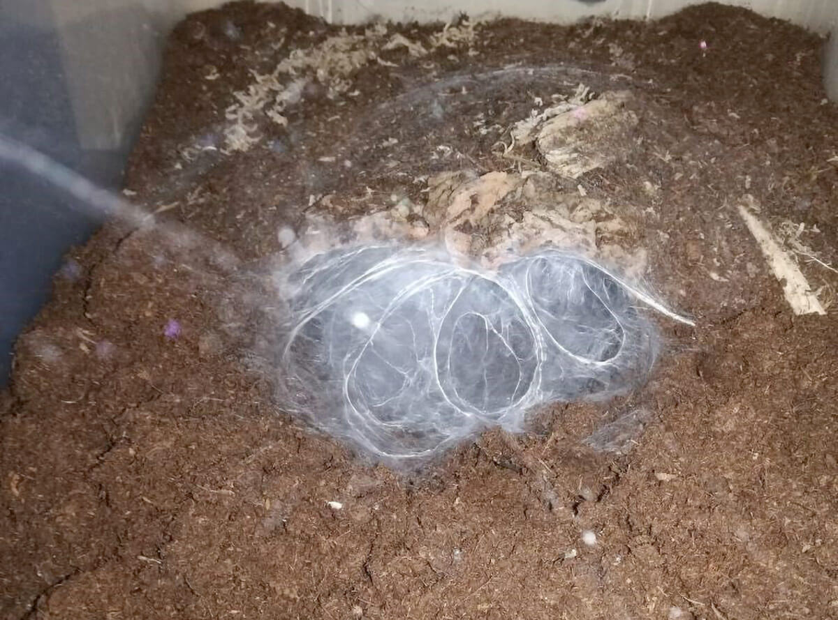 Dopo ben quasi 10 mesi ha inizio la deposizione. Se viene fornito un set up adeguato, l’entrata della tana viene completamente sbarrata per evitare intrusioni da parte di elementi esterni come sporcizia, predatori o comunque ospiti indesiderati. La chiusura della tana e la preparazione dell’ovisacco va fatto coincidere con il graduale abbassamento dell’umidità del terreno e l’innalzarsi delle temperature.