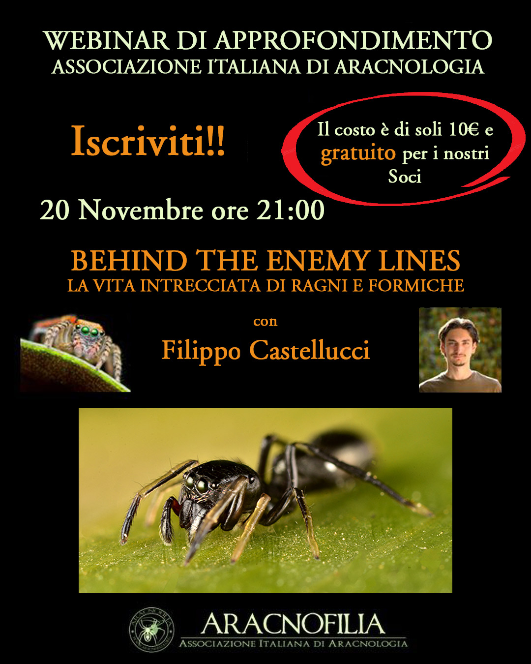 Avete mai sentito parlare di mirmecofilia o mirmecomorfia? Curiosi di sapere qualcosa in più su questo affascinante argomento? In questo webinar Filippo Castellucci, naturalista e biologo evoluzionista e Consigliere di Aracnofilia, vi racconterà di più sulla vita intrecciata di ragni e formiche.