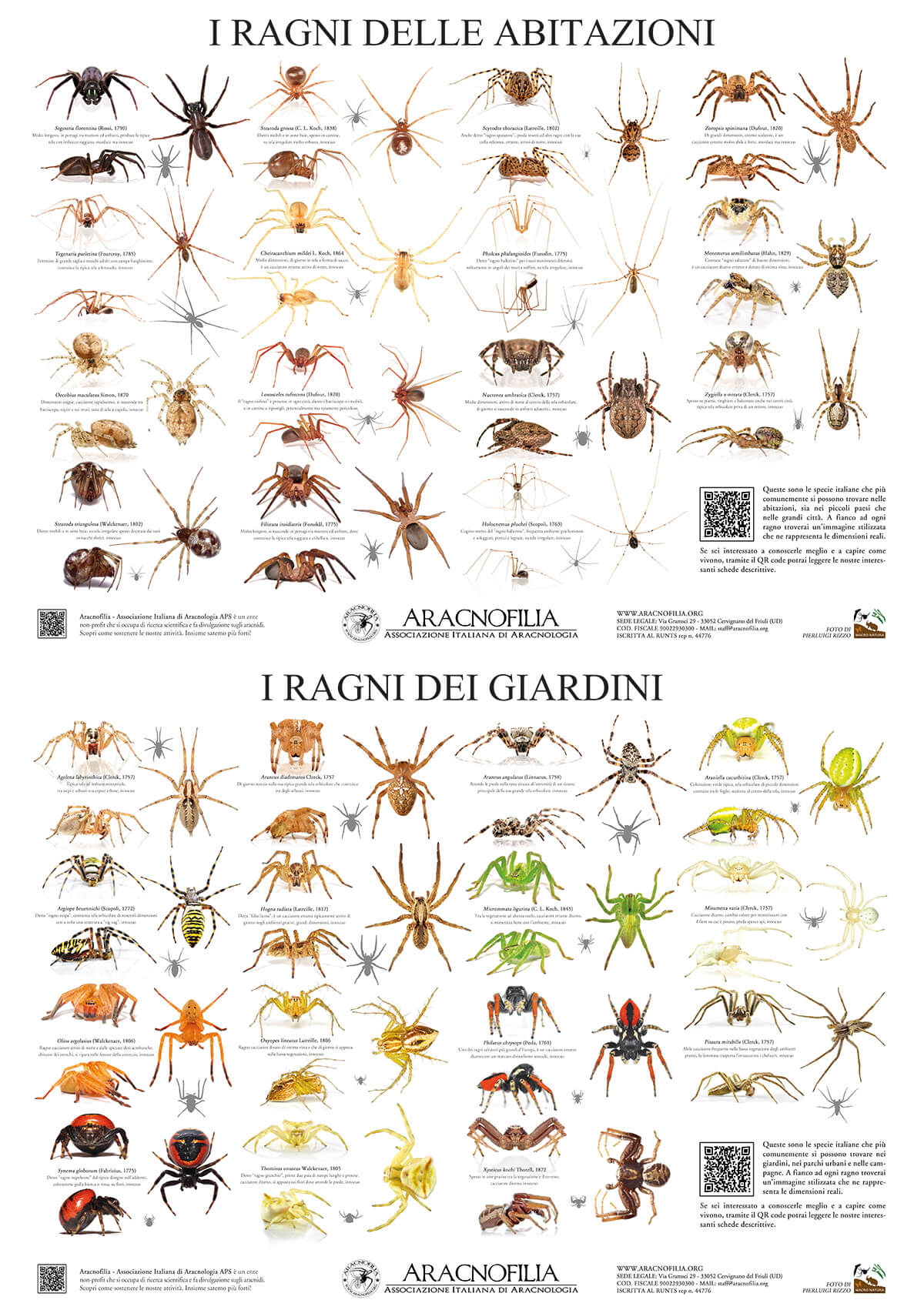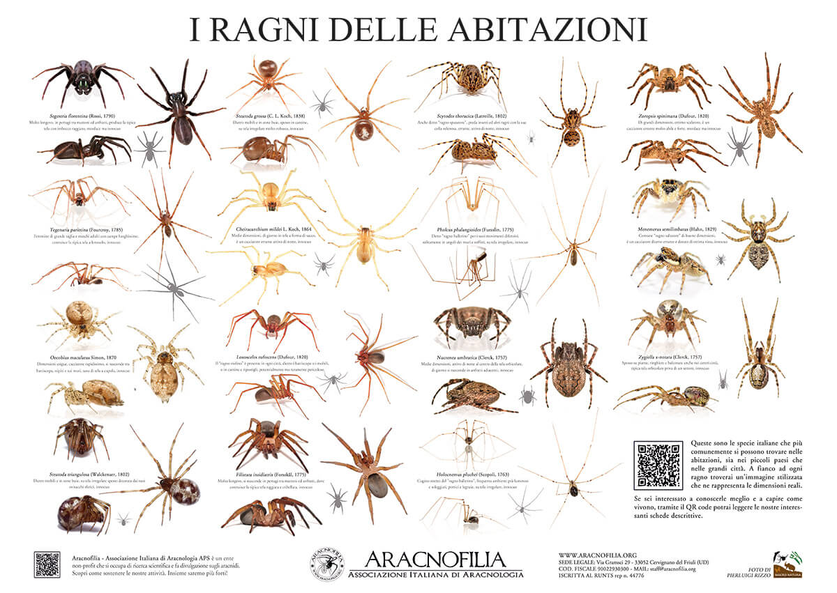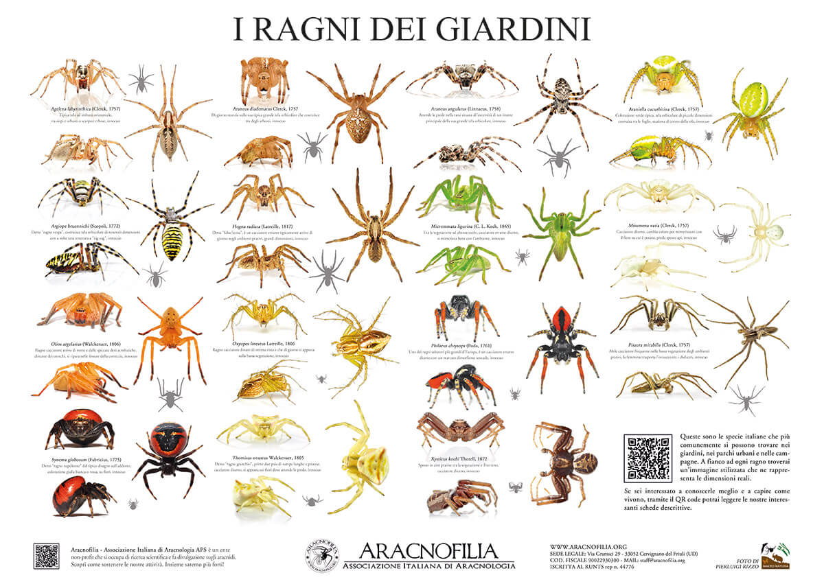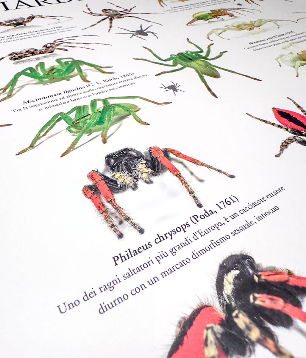 I poster, realizzati dall’Associazione grazie al contributo fotografico del nostro socio e fotografo Pierluigi Rizzo, hanno dimensioni 85 x 60 cm, sono stampati in carta spessa di alta qualità con finitura opaca e plastificata per renderli duraturi nel tempo. Oltre alle didascalie delle specie più comuni, un QR code vi porterà a descrizioni più approfondite su questi ragni, cosi da rendere il poster uno strumento didattico per famiglie e scuole.